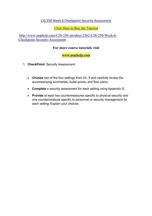 CJS 250 Week 5 Checkpoint Evaluating Safe Work Conditions Appendix E. CJS 250 Week 5 Checkpoint Floor Plan. CJS 250 Week 6 Checkpoint Security Assessment. CJS 250 Week 6 DQ 1 and DQ 2. CJS 250 Week 7 Checkpoint Public Relations and Professionalism. ... View This Document